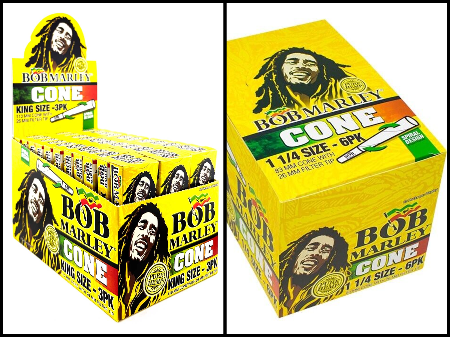 The Bob Marley Rolling Paper Cone offers a premium rolling experience with eco-friendly, organic hemp cones. Available in 1 1/4 size with 6 cones per pack and King Size with 3 cones per pack, these pre-rolled cones provide a smooth, clean burn, and are perfect for those who appreciate quality and convenience.