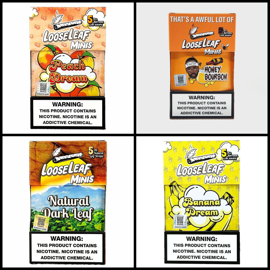 The Loose Leaf Minis 5pk (8ct/box) offers a premium smoking experience with 5 wraps per pack, and each box contains 8 packs. These mini wraps are made from high-quality natural tobacco, providing a smooth, satisfying smoke in a more compact form.