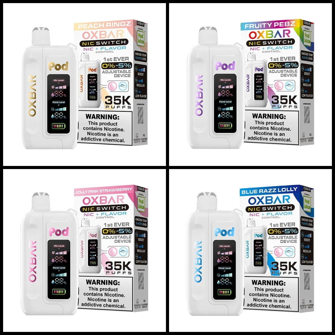 Introducing the Oxbar by Pod Juice Nic Switch Control 35K Puffs Disposable, a groundbreaking device that offers unparalleled customization in your vaping experience. This innovative disposable vape allows you to adjust both nicotine strength and flavor intensity, ensuring a personalized and satisfying vape every time.